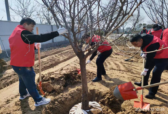 活動現(xiàn)場黨旗飄揚,黨員干部熱情高漲,揮鍬鏟土、扶樹填土,每個環(huán)節(jié)都銜接有序、一絲不茍,呈現(xiàn)出一片熱火朝天的忙碌景象,展現(xiàn)了黨員干部積極向上的精神風貌。在大家的共同努力下,一株株新栽樹苗昂然挺立,錯落有致,煥發(fā)勃勃生機,為園區(qū)增添一片綠色。