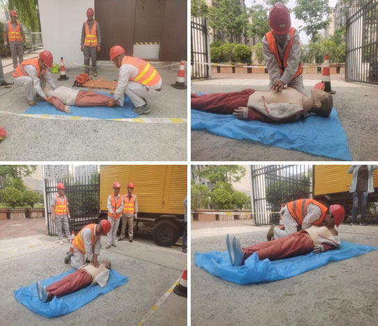 “快來(lái)人啊,有人觸電了!”,隨著一聲呼救,演練正式開始。演練人員按照預(yù)案,迅速采取各項(xiàng)應(yīng)急處置措施:立即斷開電源,移動(dòng)觸電者,判斷觸電者意識(shí),撥打120請(qǐng)求救援,向上級(jí)報(bào)告事故情況,開展臨時(shí)救護(hù),采取“口對(duì)口人工呼吸法”和“心臟胸外擠壓法”對(duì)觸電人員進(jìn)行急救。參演人員一一進(jìn)行模擬操作,掌握動(dòng)作要領(lǐng)。