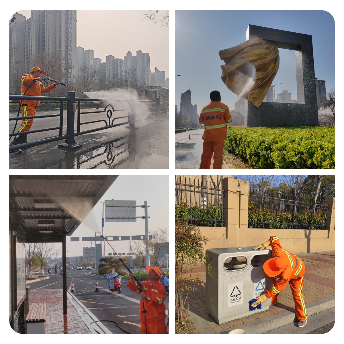 “立面”清洗,“洗”出“高顏值”。采用“擦、洗”相結(jié)合,對公交站臺、交通護(hù)欄、果殼箱、雕塑小品等城市家具進(jìn)行了深度清潔,在日常擦拭的基礎(chǔ)上,集中開展了一次設(shè)施“立面”大清洗,洗去冬日積塵,重現(xiàn)靚麗本色。