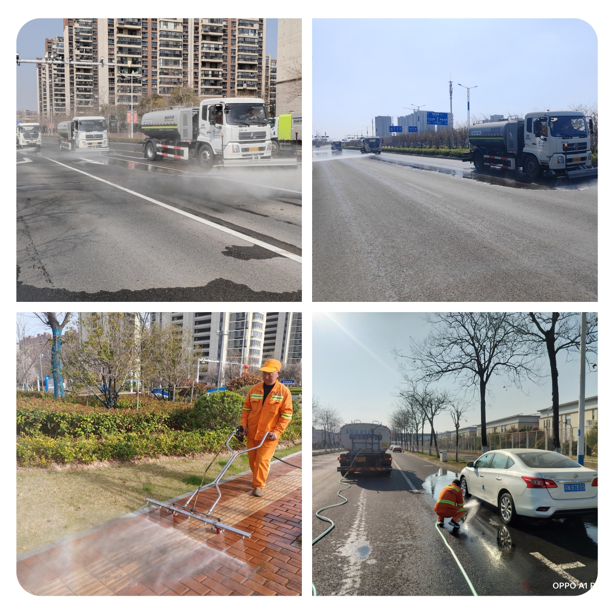 “平面”清洗,“洗”道路本色。采用“洗、沖、刷、掃”組合作業(yè),高壓清洗車、灑水車、洗掃車協(xié)同“作戰(zhàn)”,對園區(qū)主次干道進(jìn)行了深度清洗,確保道路恢復(fù)本色,標(biāo)線清晰。針對人行道、交叉路口、停車泊位等大中型車輛作業(yè)盲區(qū),使用小型高壓清洗車和人工沖洗進(jìn)行“補(bǔ)位”作業(yè),確保無盲區(qū)、無死角,實(shí)現(xiàn)清潔全覆蓋,讓園區(qū)每一條道路都“煥然一新”。