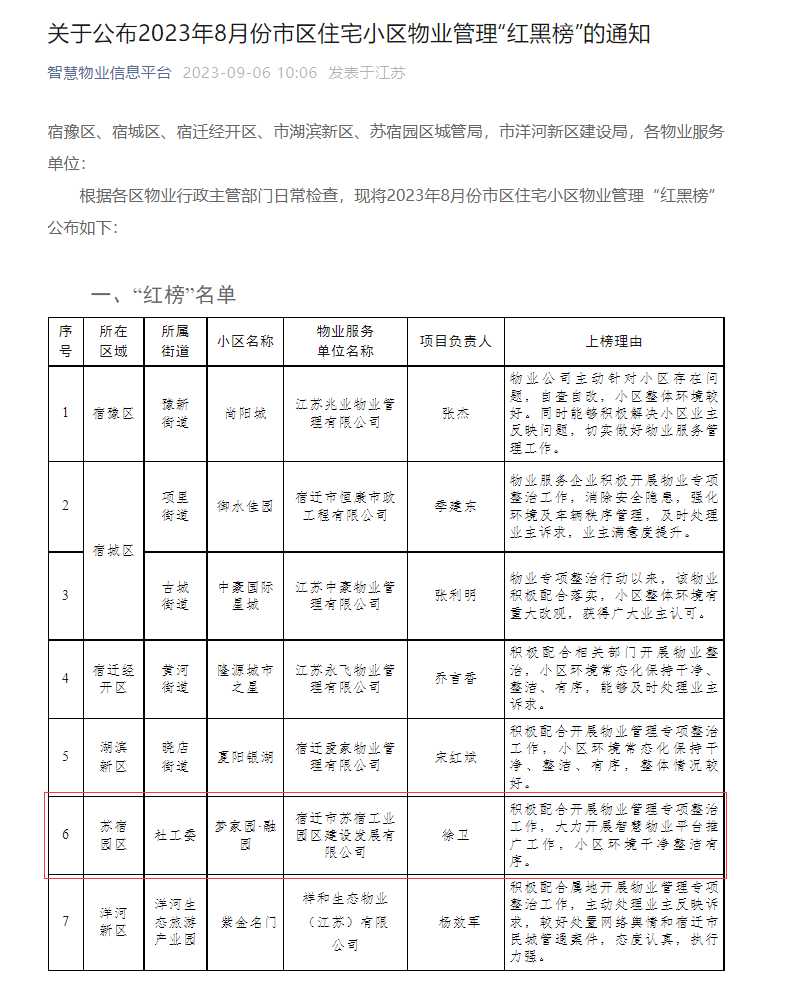 物業(yè)服務好不好,“紅黑榜”上見分曉。8月29日,宿遷市住房和城鄉(xiāng)建設局公布8月份市區(qū)住宅小區(qū)物業(yè)管理“紅黑榜”?,建發(fā)公司夢家園項目物業(yè)服務質(zhì)量綜合考評“優(yōu)秀”,榮登“紅榜”。