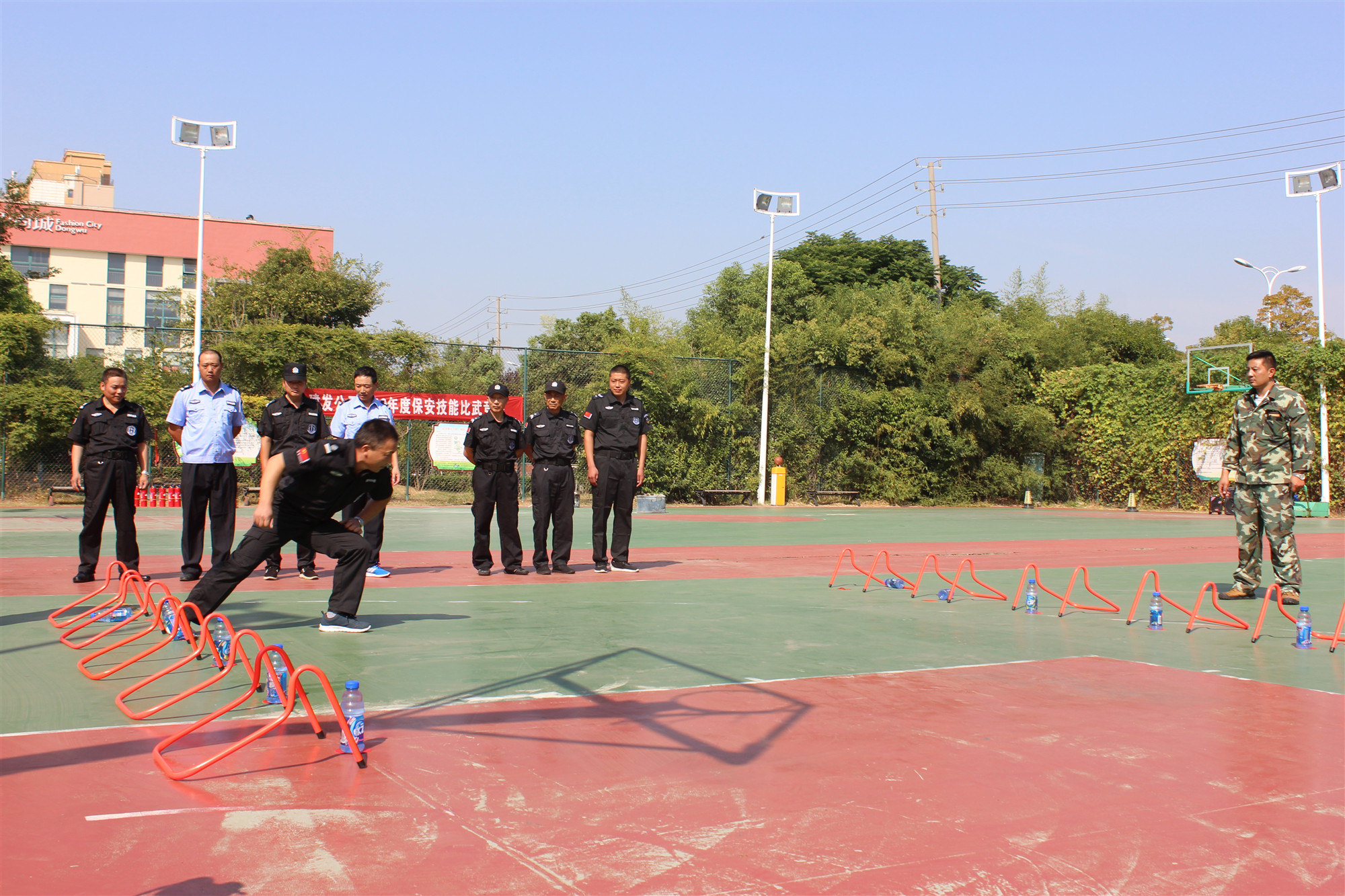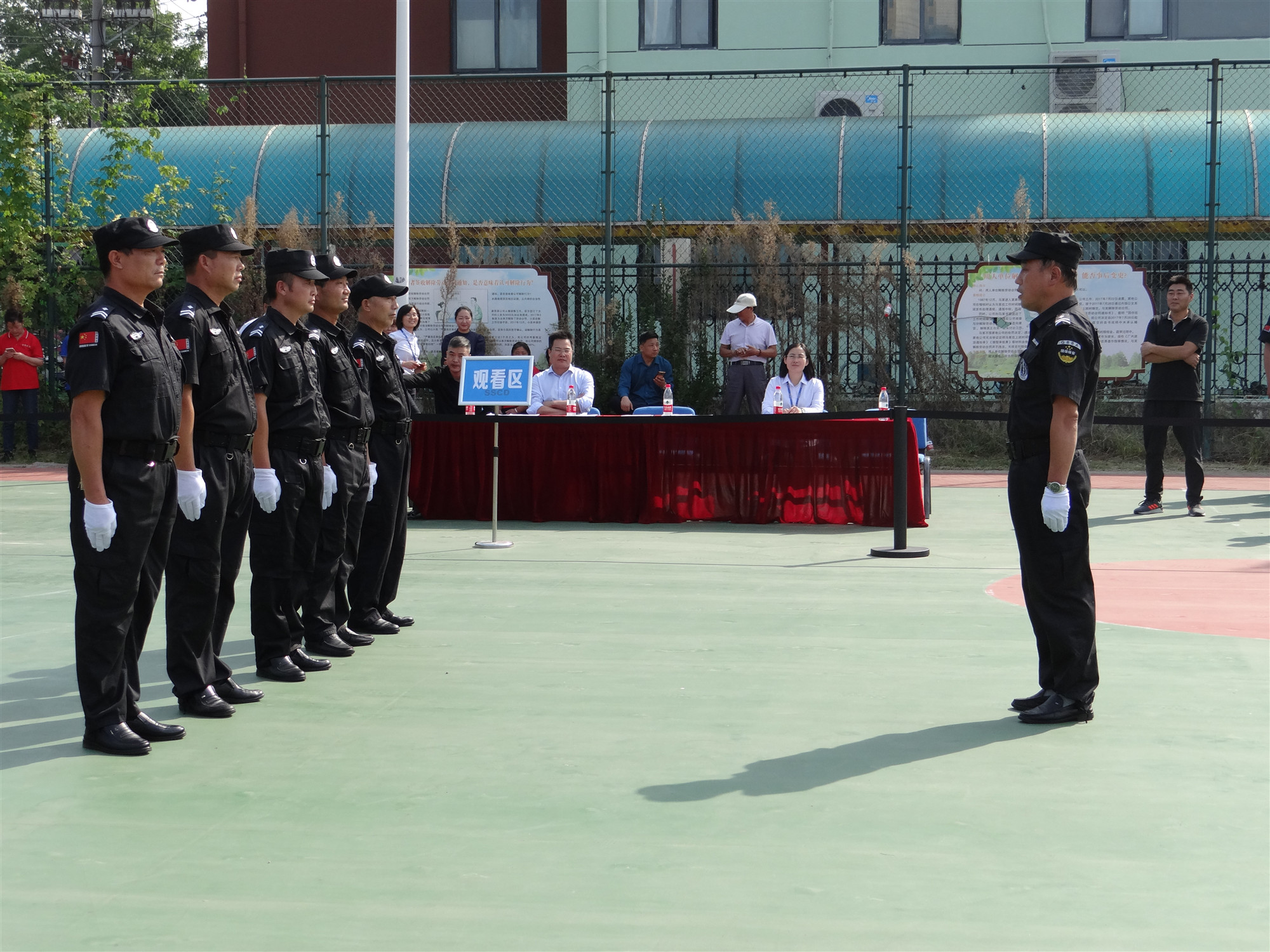 本次安保大比武活動共有3家參賽隊伍,分別是蘇宿工業(yè)坊項目單位江蘇國保、園區(qū)公舍項目單位江蘇天翔、外國語學校項目單位蘇州君鼎代表隊,共計60余人,各支隊伍紛紛選派精兵參加比拼。參賽隊伍一一進行隊列展示,評委進行統(tǒng)一打分,在3支參賽隊伍完成會操比賽后,又進行了消防業(yè)務、體能等項目,現場你追我趕,體現了團隊風采。