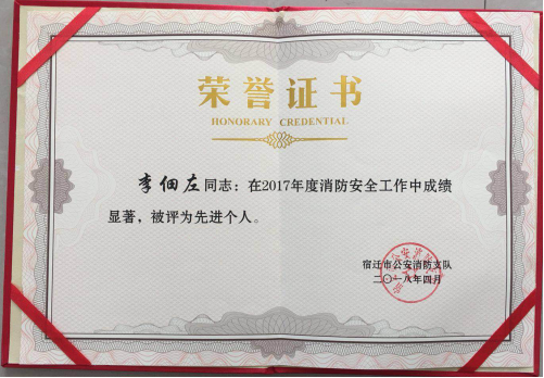 5月2日下午,宿遷市公安消防支隊召開了“全市一級消防安全重點(diǎn)單位“工作會議,建發(fā)公司物業(yè)部安防主管李佃左同志在2017年消防安全工作中成績顯著,被評為先進(jìn)個人。