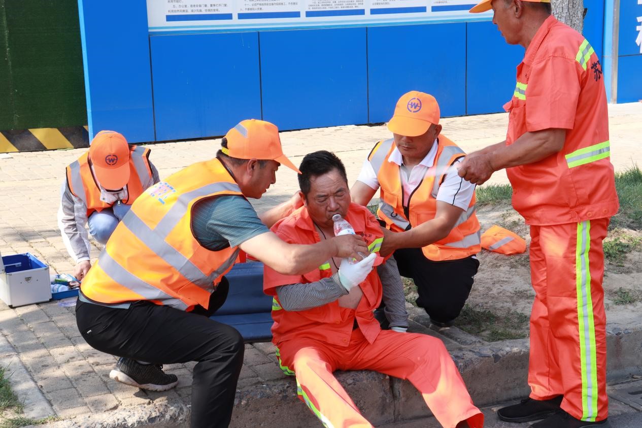 此次演練模擬一名環(huán)衛(wèi)工人在作業(yè)過程中,突然感到頭暈、心慌乏力,立即向主管人員電話求助。主管人員隨即趕到現(xiàn)場查看情況,發(fā)現(xiàn)環(huán)衛(wèi)工人躺坐在現(xiàn)場,面色潮紅、大汗淋漓,精神狀況不佳,系中暑跡象,立即向項(xiàng)目經(jīng)理報(bào)告,聯(lián)系應(yīng)急救援人員,并呼喊附近作業(yè)人員將其攙扶到陰涼處,解開衣扣散熱,應(yīng)急救援人員趕到現(xiàn)場后,立即用濕毛巾、酒精棉擦拭身體,涂上清涼油,喂服藿香正氣水、淡鹽水......,經(jīng)過初步救護(hù),中暑人員癥狀得以緩解后,隨即將其送往園區(qū)社區(qū)衛(wèi)生服務(wù)中心進(jìn)一步治療。