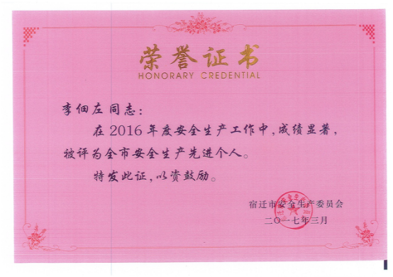 2017年3月,物業(yè)部李佃左同志獲得宿遷市安全生產(chǎn)委員會授予的“全市安全生產(chǎn)先進個人”榮譽證書。