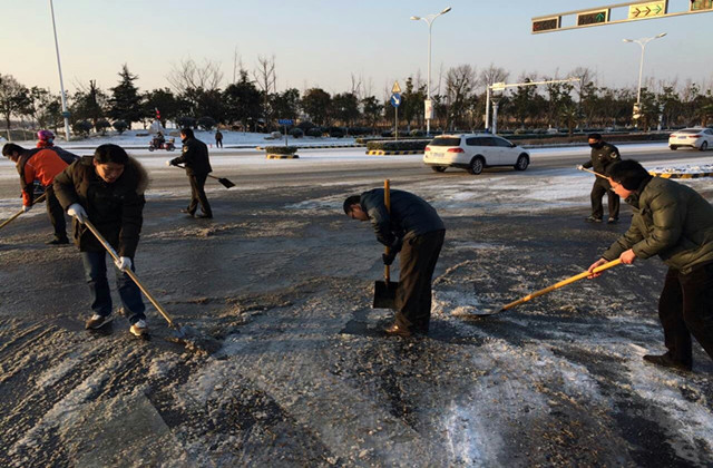 清晨6時,市政部工作人員和環(huán)衛(wèi)工人已經(jīng)開始對轄區(qū)部分主要路段進(jìn)行除雪除冰作業(yè)。在凜冽寒風(fēng)中,他們不畏嚴(yán)寒,經(jīng)過近3小時的清掃除冰,截至上午9時,青海湖西路、通達(dá)大道、紫金山路等主干道及蘇州公園人行道已基本完成路面積雪清掃。